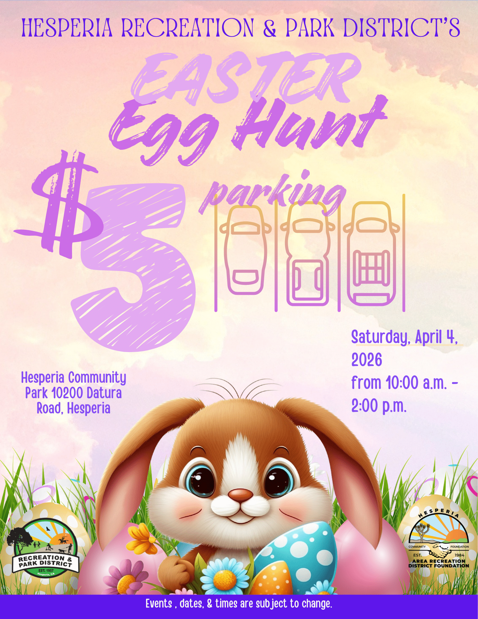 Celebrate spring with our annual Easter Egg Hunt at Hesperia Community Park! Families are invited to enjoy a morning of playful fun, colorful eggs, and cheerful surprises. The event features age-divided egg hunts, vendors, music, bounce houses, a petting zoo, and photos with the Easter Bunny. Don’t forget your basket and camera to capture the memories for this joyful community tradition.