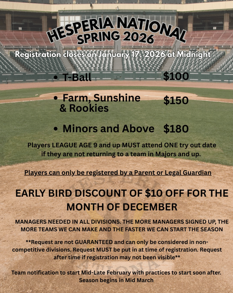 REGISTRATION IS OPEN FOR HESPERIA NATIONAL LITTLE LEAGUE.