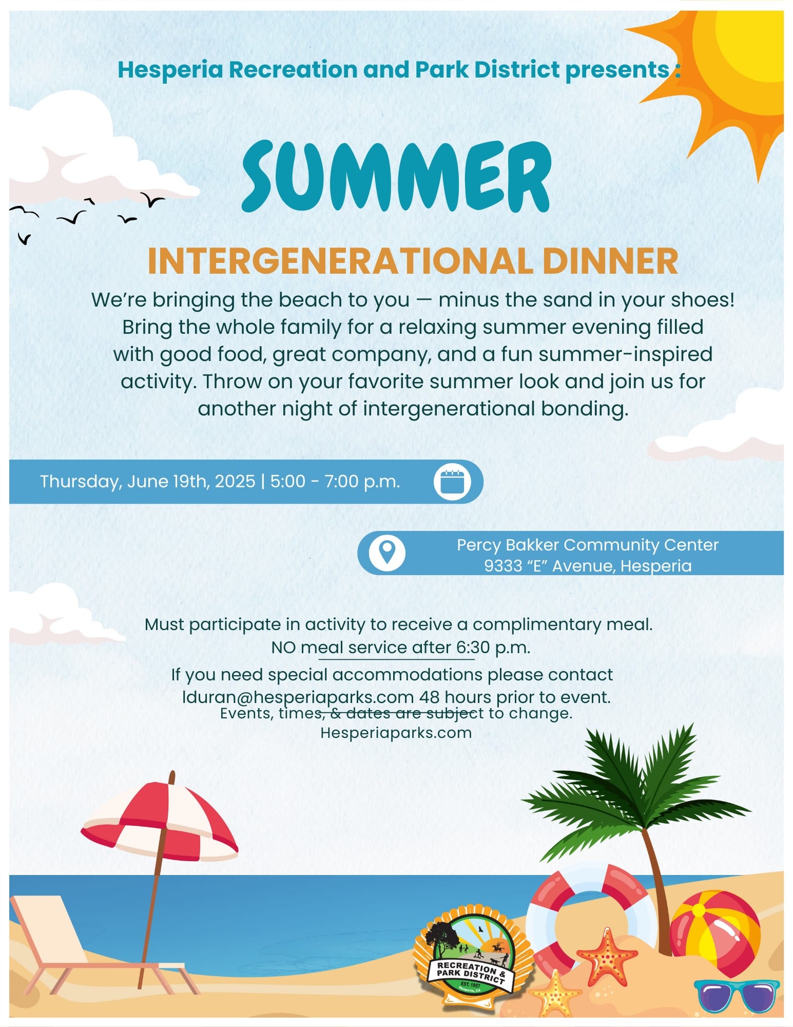 | FreeWelcome Summer! And what better way to celebrate than with your friends and family at the Intergenerational Dinner! Join us Thursday June 19th, 2025 from 5 – 7pm for summer food, socializing and themed activities. Its always a great time, bring your friends or come and meet new ones. This monthly dinner is open to everyone and is free as long as you participate in the activity. We look forward to seeing you at the Percy Bakker Community Center !