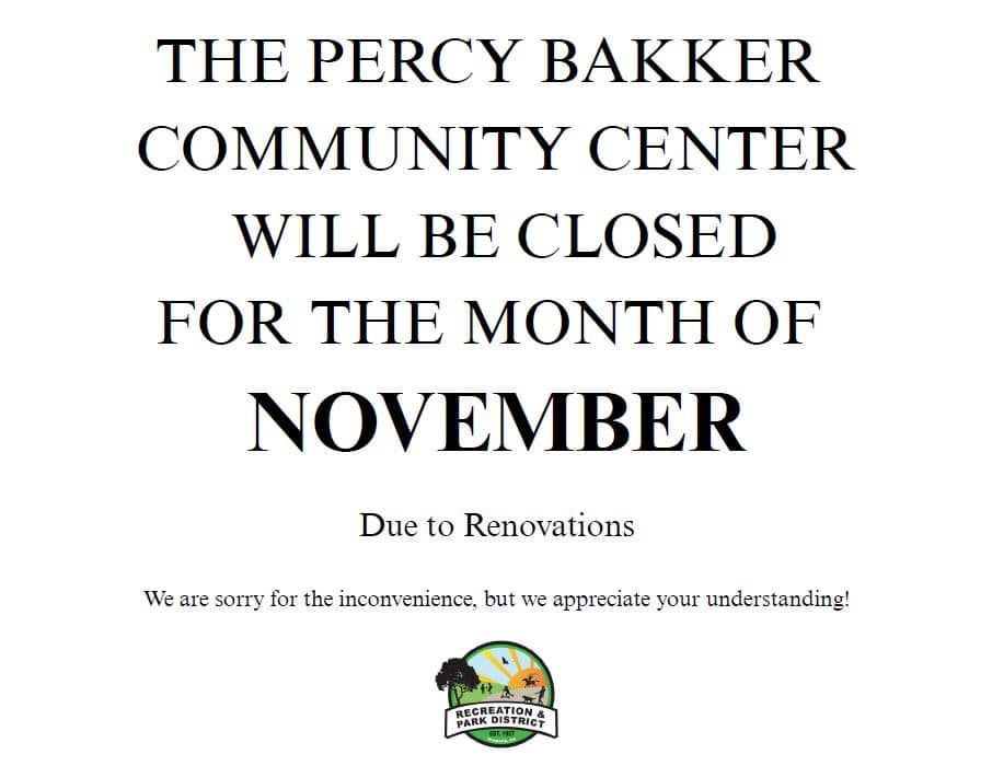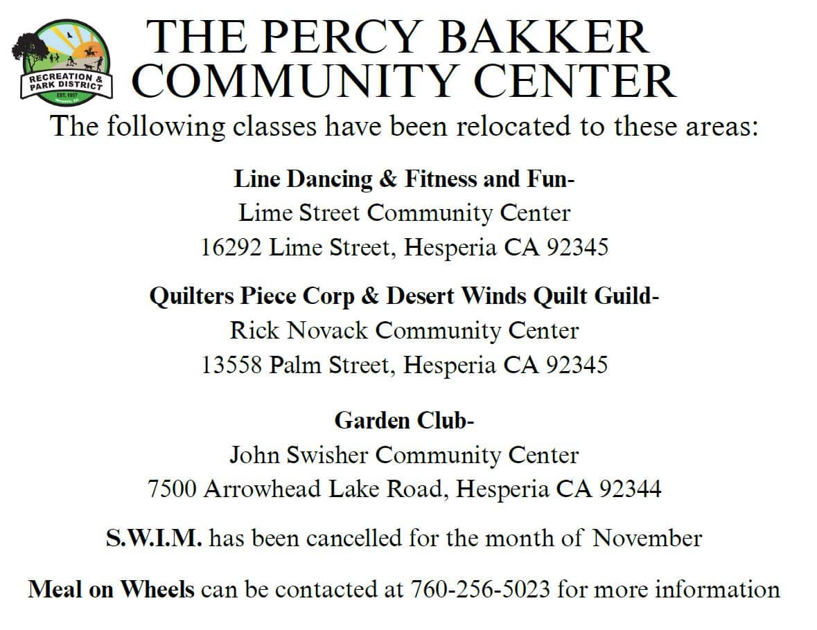 Percy Bakker Community Center will be closed the month of November due to renovations. Classes will be moved to another site for the month of the closure. Please see pictures showing where the classes will be held.